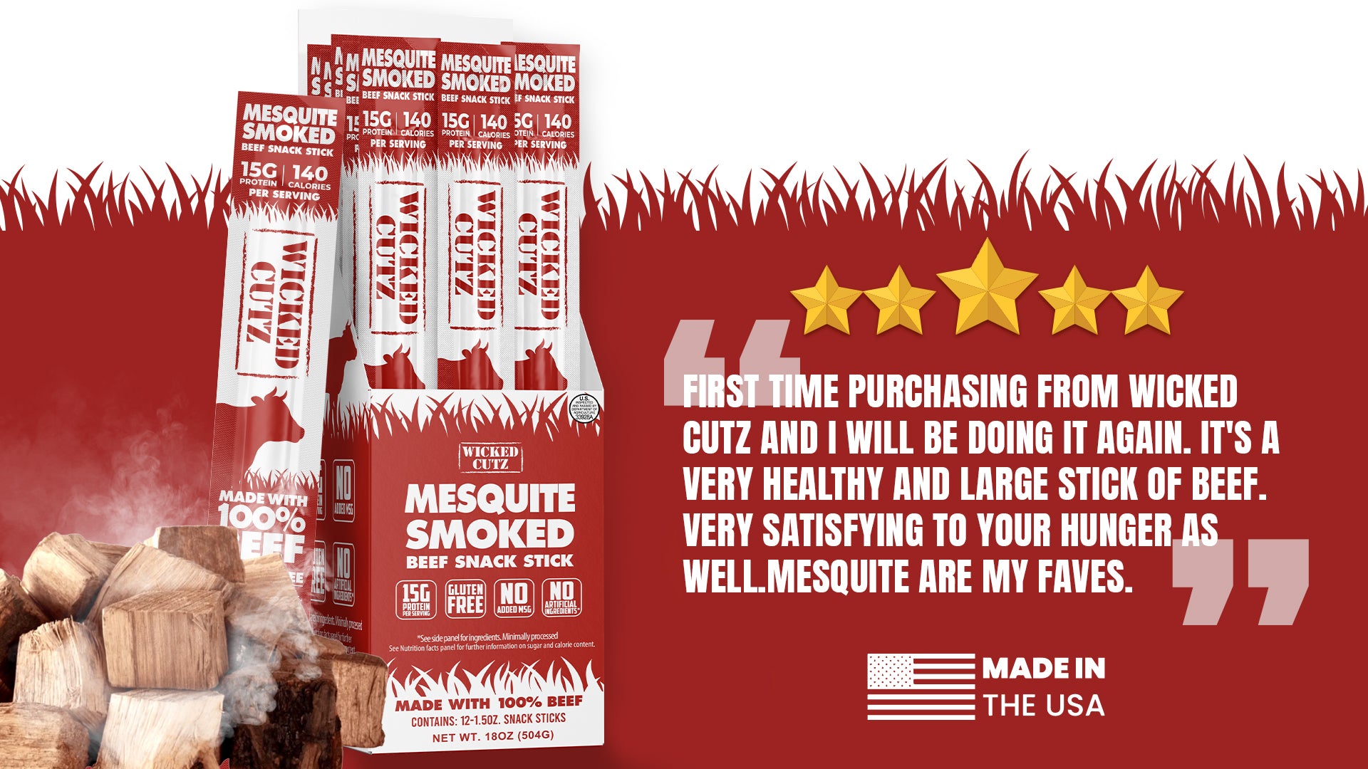 If you want the most pure experience from a Beef Stick then try our Smoked Mesquite Flavor. The strong Mesquite Wood gives it a sweet earthy taste complementing the beef. Not too salty and not too sweet, Just a perfect in between!