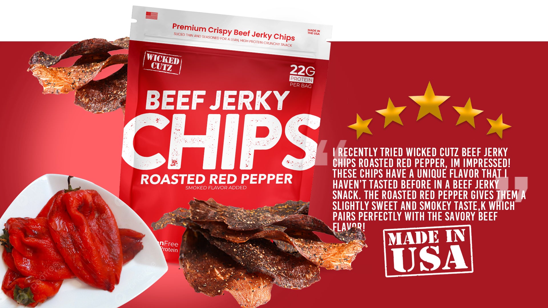 Discover the perfect balance of protein and flavor with our Roasted Red Pepper Jerky Chip. Packed with premium beef and spicy chili peppers, it's a fiery snack that's sure to hit the spot. Don't believe us? Try it for yourself and we promise you'll be addicted before you can say "hot dang!"