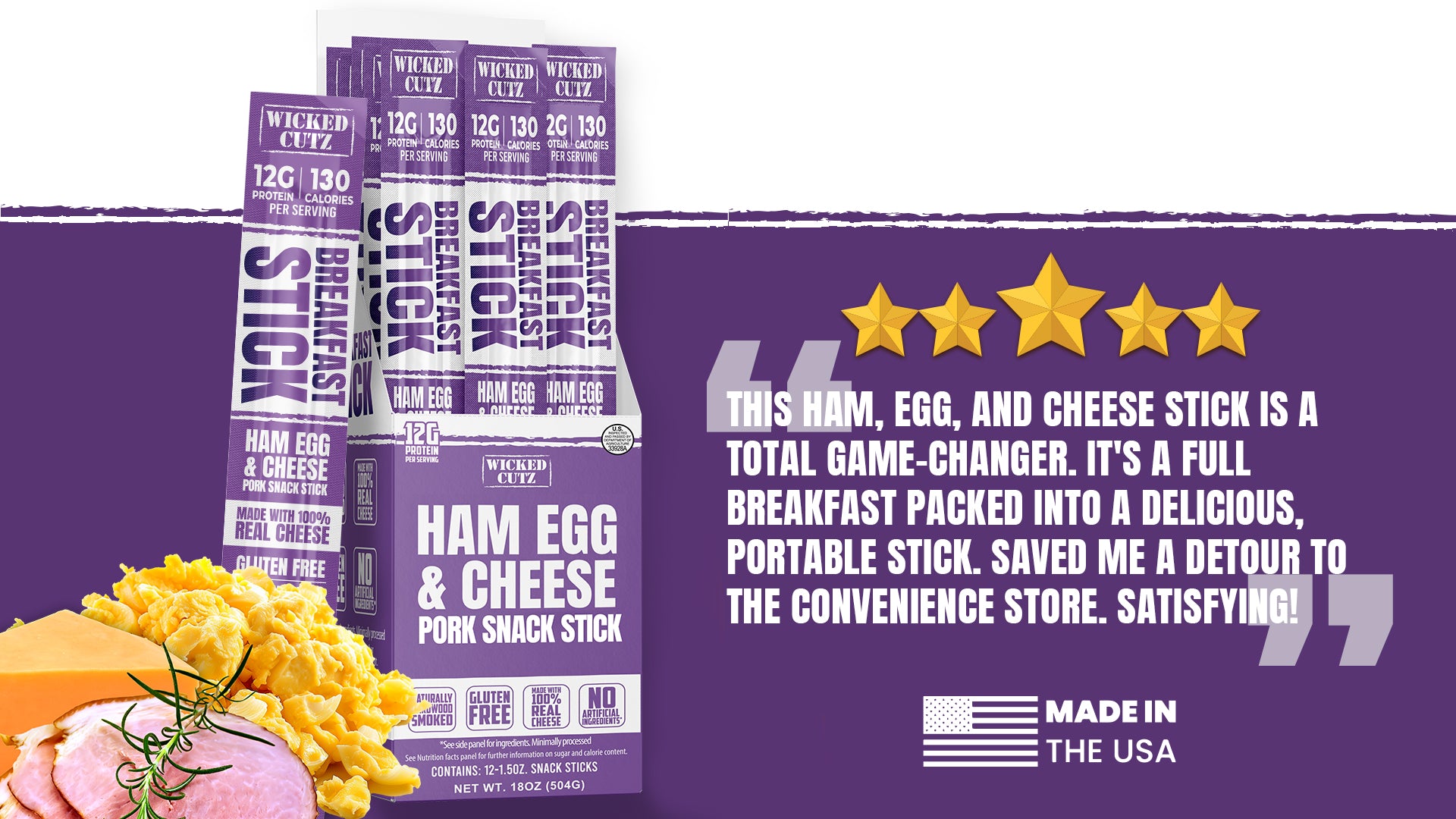 Introducing the Wicked Cutz Ham Egg & Cheese Breakfast Stick® - the ultimate grab-and-go breakfast change-up! With real egg and cheese, this gluten-free stick packs a protein punch and is guaranteed to shake up your morning routine. Get your hands on this game-changing breakfast item!